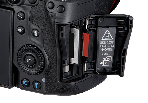 - Canon EOS R5: 1 khe CFexpress Type B, 1 khe SD UHS-II.