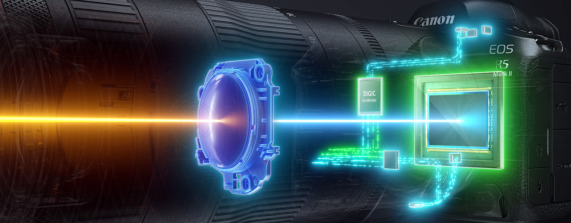 - Canon EOS R5 Mark II: Cảm biến CMOS Full-frame 45MP Back-Illuminated Stacked mới và bộ xử lý DIGIC X với DIGIC Accelerator chip.